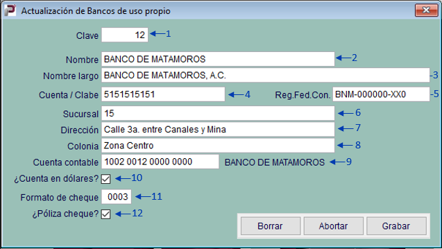 CLAVE: En esta ventana se agrega y/o actualiza el catálogo de instituciones bancarias de la empresa, así como su respectiva cuenta contable. Recuerde que para dar de alta una nueva cuenta contable de bancos, se declara la clave del banco y se asigna la cuenta contable de acuerdo al mayor de bancos y la clave consecutiva del mismo. Indique el número de banco a actualizar.