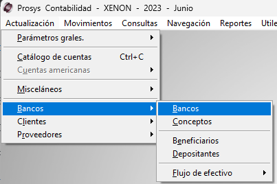 Para acceder al módulo de bancos y empezar con la captura, tendremos que entrar al sistema y posteriormente en Actualización / Bancos / Bancos